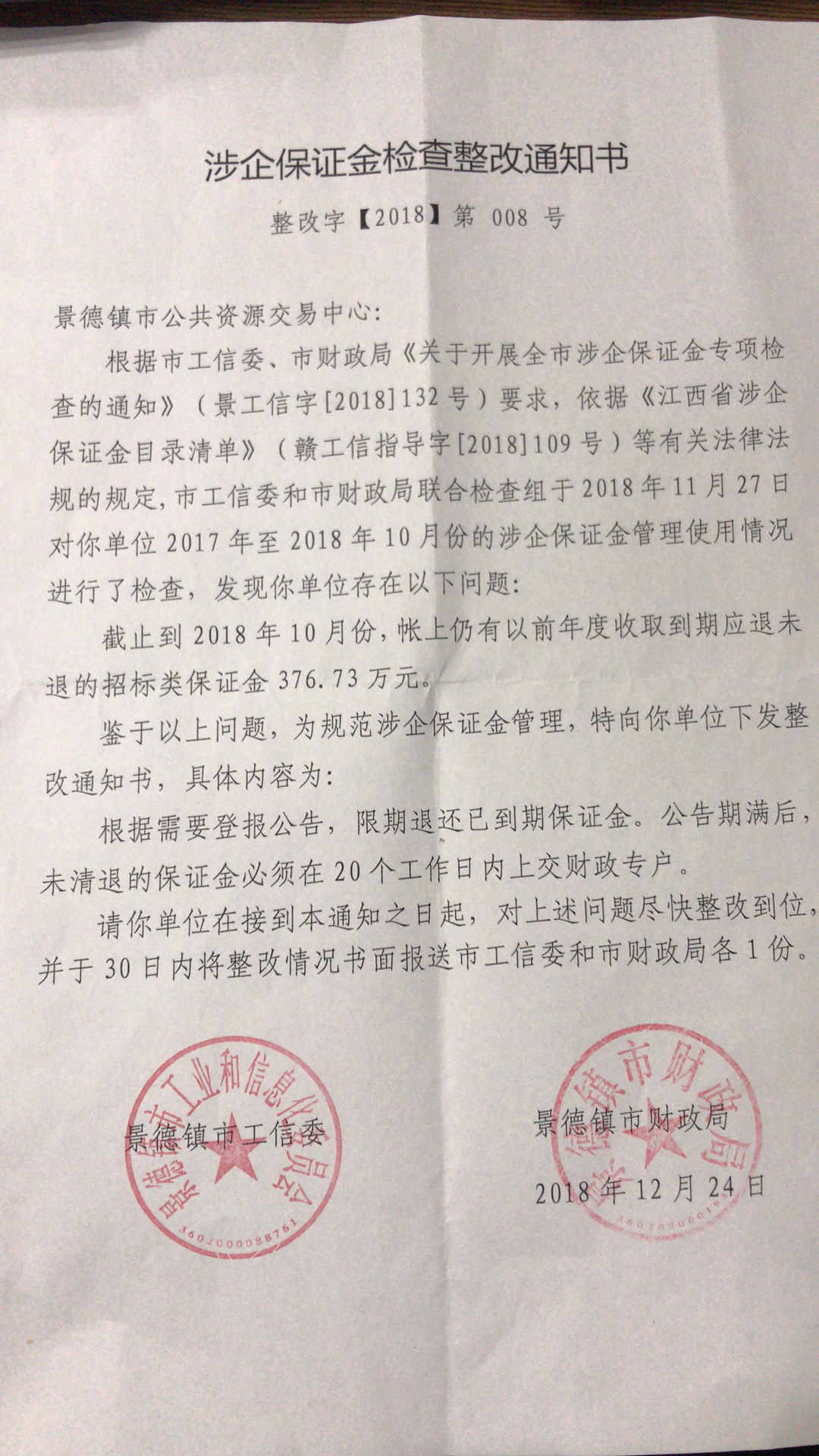 涉企保证金检查整改通知书